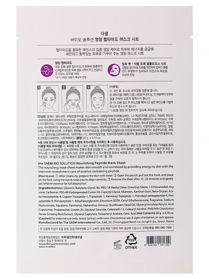 Изготовитель: THE SAEM INTERNATIONAL CO.LTD., КОРЕЯ, РЕСПУБЛИКА, 10F, 35, Cheonggyecheon-ro, Jongno-gu, Seoul. Питательная маска с пептидами BIO SOLUTION Nourishing Peptide Mask Sheet –делает кожу гладкой и оживленной. Входящие в состав пептиды питают, осветляют и повышают упругость кожи, сводя к минимуму выраженность мелких и глубоких морщин. Пептиды – замедляют процессы старения; обеспечивают эффект лифтинга. Способ применения: после умывания лица используйте тонер для очищения кожи. Равномерно распределите маску по коже, оставьте на 20-25 минут, остатки эссенции распределите по коже лица.
