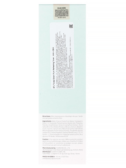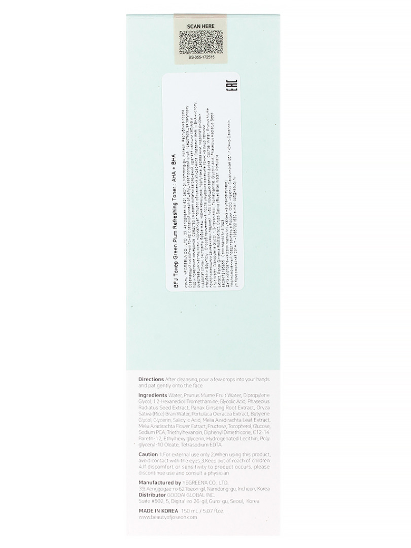 BFJ Toner Тонер для лица освежающий с экстрактом зеленой сливы Green Plum Refreshing Toner : AHA + BHA,150мл