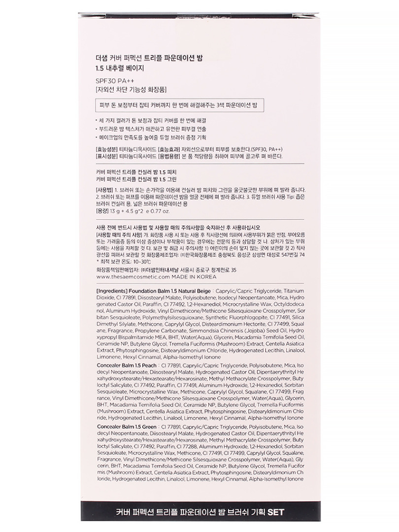 Изг-ль: THE SAEM INTERNATIONAL CO.LTD., КОРЕЯ, РЕСПУБЛИКА, 10F, 35, Cheonggyecheon-ro, Jongno-gu, Seoul. Палетка с тональным бальзамом, которая сочетает в себе сразу 3 оттенка: персиковый/зеленый (консилер), бежевый (тональная основа). Бальзам корректирует тон кожи и одновременно скрывает веснушки, неровности, покраснения, темные пятна и т.д. Текстура средства равномерно и плотно ложится на кожу, создавая ровный и чистый тон кожи. В наборе: кисточка. Способ применения: с помощью кисти или пуховки нанесите на неровные участки или покраснения консилер-бальзам персикового/зеленого цвета, далее нанесите тональный бальзам.