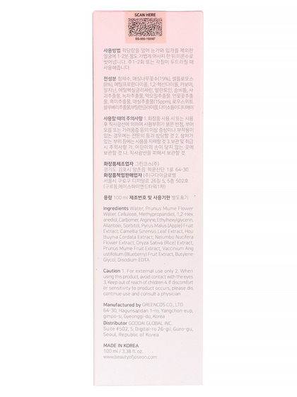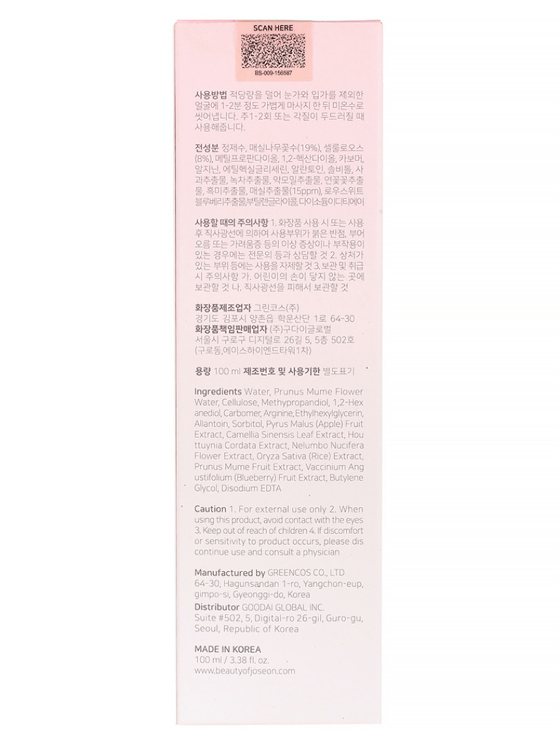 Water, Prunus Mume Flower Water, Cellulose, Methypropandiol, 1,2-Hex anediol, Carbomer, Arginine, Ethythexyiglycerin, Allantoin, Sorbitöl, Pyrus Malus (Apple) Fruit Extract, Camellia Sinensis Leaf Extract, Hou ttuynia Cordata Extract, Nelumbo Nucifera Flower Extract, Oryza Sativa (Rice) Extract, Prunus Mume Fruit Extract, Vaccinium Ang ustifolium (Blueberry) Fruit Extract, Butylene Glycol, Disodium EDTA