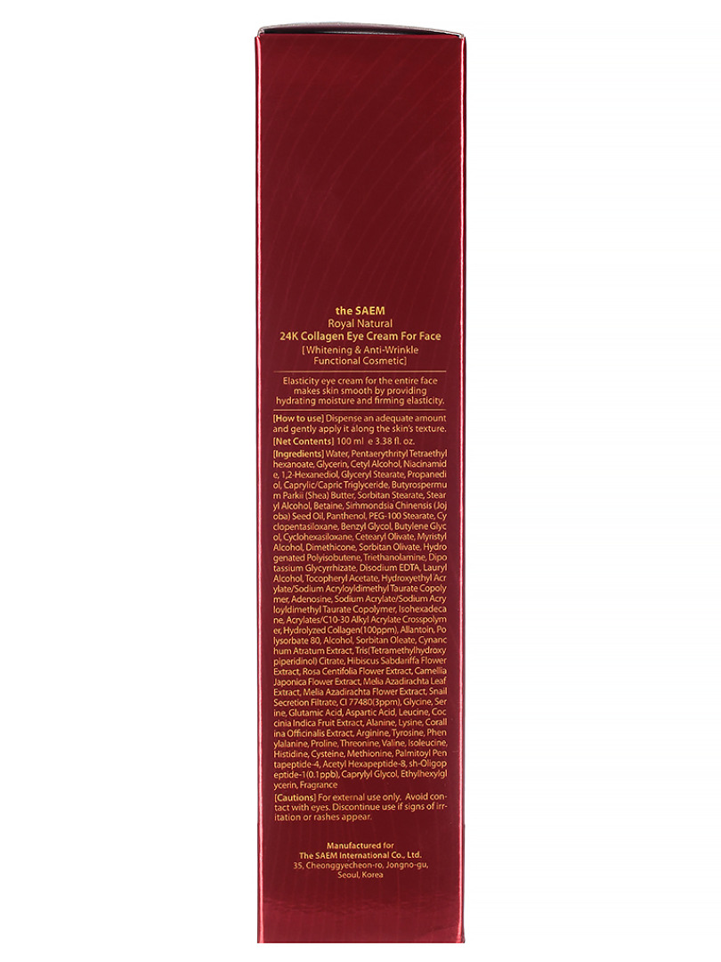 Изг-ль: THE SAEM INTERNATIONAL CO.LTD., КОРЕЯ, РЕСПУБЛИКА, 10F, 35, Cheonggyecheon-ro, Jongno-gu, Seoul. Крем для кожи вокруг глаз с 24К золотом и коллагеном оказывает комплексный уход за кожей: придает коже гладкость, увлажнение и упругость. Ионы 24-каратного золота являются природными проводниками влаги и питания. Гидролизованный коллаген обеспечивает эластичность и плотность тканей, подтягивает контур лица. Также содержит 17 аминокислот, масло ши, экстракты гибискуса, камелии, розы и т.д. Крем может использоваться на всей поверхности лица. Способ применения: нанести средство на очищенную и тонизированную кожу в области глаз и лица.
