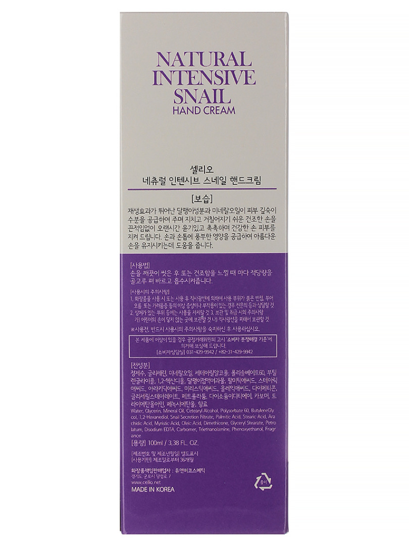 CELL HAND Крем для рук с муцином улитки CELLIO NATURAL INTENSIVE SNAIL HAND CREAM,100мл