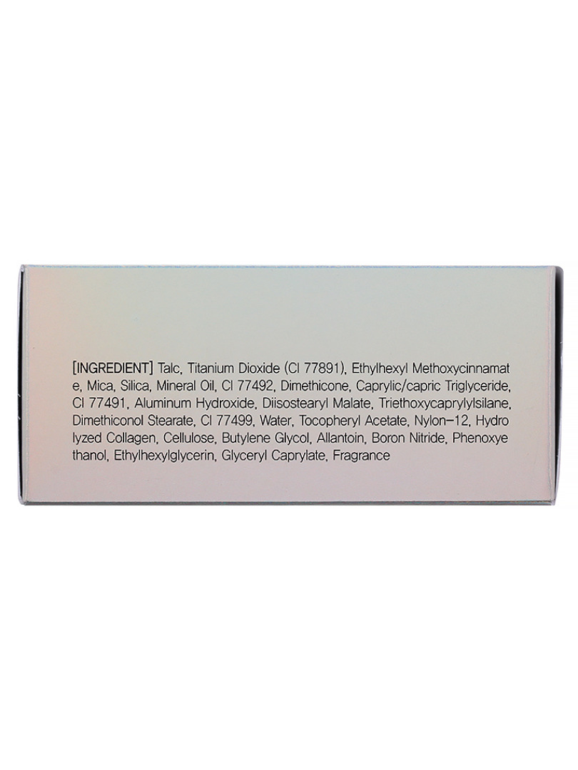 Talc, Titanium Dioxide (CI 77891), Ethylhexyl Methoxycinnamate, Mica, Silica, CI 77492, Mineral Oil, Dimethicone, CI 77491, Caprylic/capric Triglyceride, CI 77499, Aluminum Hydroxide, Diisostearyl Malate, Triethoxycaprylylsilane, Dimethiconol Stearate, Water, Tocopheryl Acetate, Nylon-12, Hydrolyzed Collagen, Cellulose, Butylene Glycol, Allantoin, Boron Nitride, Phenoxyethanol, Ethylhexylglycerin, Glyceryl Caprylate, Fragrance