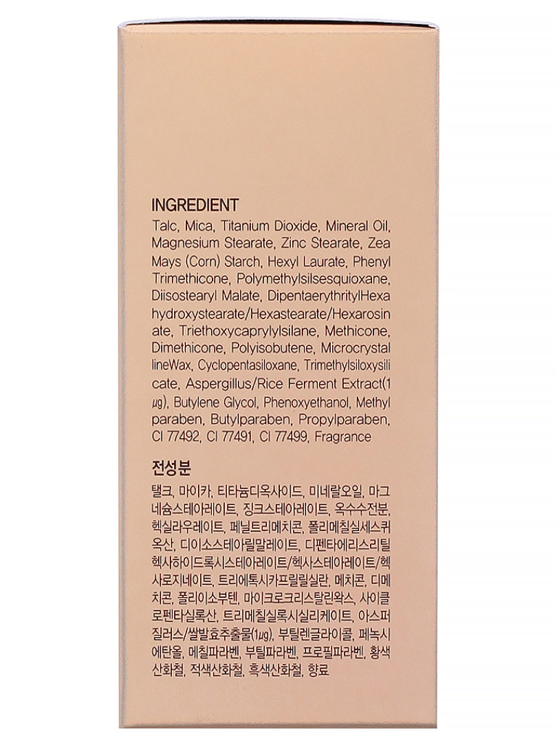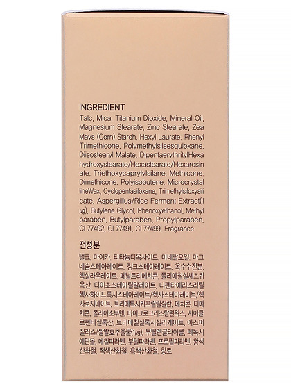 Изг-ль: You&Me Cosmetic, Корея, Республика, 7, Dangjeong-ro, Gunpo-si, Gyeonggi-do. Рисовая пудра прекрасно ложится, оставляя приятное и легкое ощущение на коже, отлично и на долго матирует кожу.Благодаря составу пудра обладает осветляющими эффектом, кожа становится шелковистой, свободно дышит и не испытывает дискомфорт.Рисовая пудра впитывает в себя лишний жир, придавая лицу матовый оттенок и выравнивая кожу. Способ применения: Набрать необходимое количество пудры на спонж, нанести на лицо и равномерно растушевать.