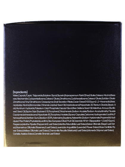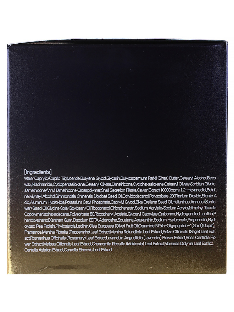 water, caprylic/capric triglyceride, butylene glycol, glycerin, butyrospermum parkii (shea butter), cetearyl alcohol, beeswax, niacinamide, cyclopentasiloxane, cetearyl olivate, sorbitan olivate, cyclohexasiloxane, 1,2-hexanediol, betaine, snail secretion filtrate, dimethicone/vinyl dimethicone crosspolymer, dimethicone, octyldodecanol, polysorbate 20, simmondsia chinensis (jojoba) seed oil, myristyl alcohol, helianthus annuus (sunflower) seed oil, chlorphenesin, titanium dioxide, phenoxyethanol, hydrogenated lecithin, carbomer, tocopheryl acetate, fragrance, sodium acrylate/sodium acryloyldimethyl taurate copolymer, caprylyl glycol, xanthan gum, disodium edta, isohexadecane, adenosine, glycine soja (soybean) oil, glyceryl caprylate, polysorbate 80, stearic acid, potassium cetyl phosphate, aluminum hydroxide, caviar extract, squalane, butylphenyl methylpropional, linalool, limonene, bixa orellana seed oil, tocopherol, astaxanthin, sodium hyaluronate, ceramide 3, ci 77480, camellia sinensis leaf extract, rosa centifolia flower extract, mentha piperita (peppermint) leaf extract, mentha rotundifolia leaf extract, salvia officinalis (sage) leaf extract, centella asiatica extract, monarda didyma leaf extract, chamomilla recutita (matricaria) leaf extract, osmarinus officinalis (rosemary) leaf extract, melissa officinalis leaf extract, lavandula angustifolia (lavender) flower extract, palmitoyl tripeptide-1, palmitoyl tetrapeptide-7, rh-oligopeptide-1