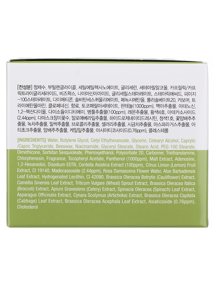 Water, Butylene Glycol, Cetyl Ethylhexanoate, Glycerin, Cetearyl Alcohol, Caprylic/Capric Triglyceride, Beeswax, Niacinamide, Glyceryl Stearate, Stearic Acid, PEG-100 Stearate, Dimethicone, Sorbitan Sesquioleate, Phenoxyethanol, Polysorbate 20, Carbomer, Triethanolamine, Chlorphenesin, Fragrance, Tocopheryl Acetate, Panthenol(1000ppm), Malt Extract, Adenosine, 1,2-Hexanediol, Disodium EDTA, Centella Asiatica Extract(100ppm), Citrus Limon (Lemon) Fruit Extract, CI 19140, Madecassoside(2.44ppm), Rosa Damascena Flower Water, Aloe Barbadensis Leaf Extract, Hydrogenated Lecithin, CI 42090, Brassica Oleracea Botrytis (Cauliflower) Extract, Camellia Sinensis Leaf Extract, Triticum Vulgare (Wheat) Sprout Extract, Brassica Oleracea Italica (Broccoli) Extract, Apium Graveolens (Celery) Extract, Spinacia Oleracea (Spinach) Leaf Extract, Asparagus Officinalis Extract, Cynara Scolymus (Artichoke) Extract, Brassica Oleracea Capitata (Cabbage) Leaf Extract, Brassica Oleracea Acephala Leaf Extract, Asiaticoside(0.76ppm), Cholesterol