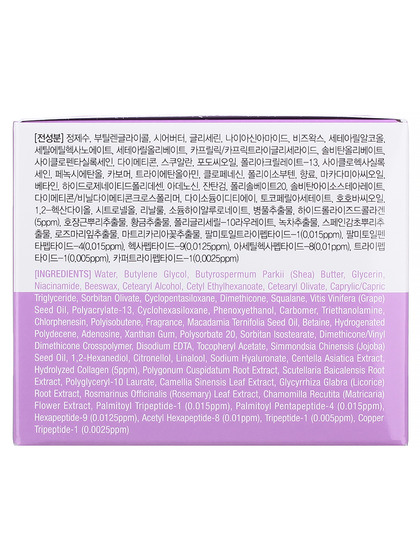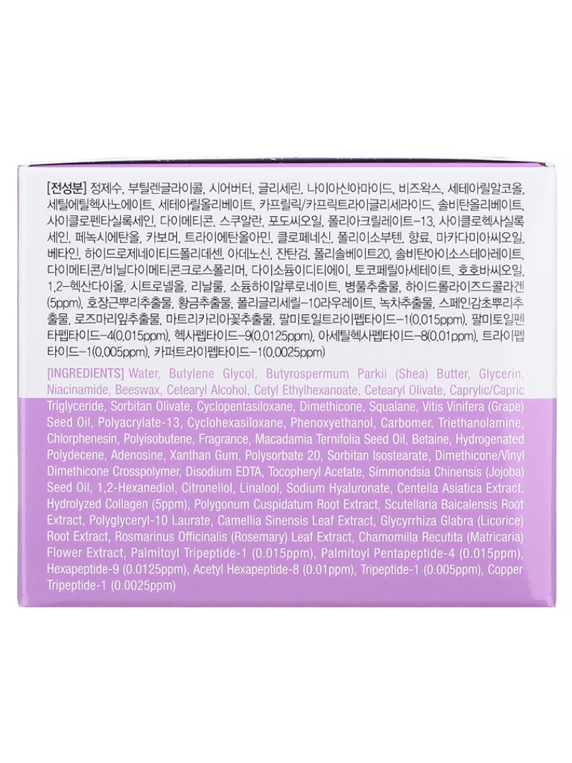 Water, Butylene Glycol, Butyrospermum Parkii (Shea) Butter, Glycerin, Niacinamide, Beeswax, Cetearyl Alcohol, Cetyl Ethylhexanoate, Cetearyl Olivate, Caprylic/Capric Triglyceride, Sorbitan Olivate, Cyclopentasiloxane, Dimethicone, Squalane, Vitis Vinifera (Grape) Seed Oil, Polyacrylate-13, Cyclohexasiloxane, Phenoxyethanol, Carbomer, Triethanolamine, Chlorphenesin, Polyisobutene, Fragrance, Macadamia Ternifolia Seed Oil, Betaine, Hydrogenated Polydecene, Adenosine, Xanthan Gum, Polysorbate 20, Sorbitan Isostearate, Dimethicone/Vinyl Dimethicone Crosspolymer, Disodium EDTA, Tocopheryl Acetate, Simmondsia Chinensis (Jojoba) Seed Oil, 1,2-Hexanediol, Citronellol, Linalool, Sodium Hyaluronate, Centella Asiatica Extract, Hydrolyzed Collagen(5ppm), Polygonum Cuspidatum Root Extract, Scutellaria Baicalensis Root Extract, Polyglyceryl-10 Laurate, Camellia Sinensis Leaf Extract, Glycyrrhiza Glabra (Licorice) Root Extract, Rosmarinus Officinalis (Rosemary) Leaf Extract, Chamomilla Recutita (Matricaria) Flower Extract, Palmitoyl Tripeptide-1(0.015ppm), Palmitoyl Pentapeptide-4(0.015ppm), Hexapeptide-9(0.0125ppm), Acetyl Hexapeptide-8(0.01ppm), Tripeptide-1(0.005ppm), Copper Tripeptide-1(0.0025ppm)