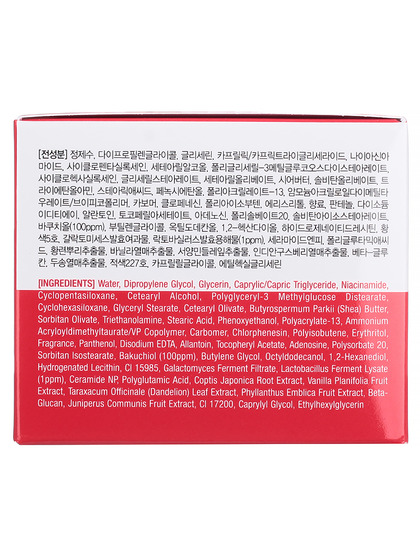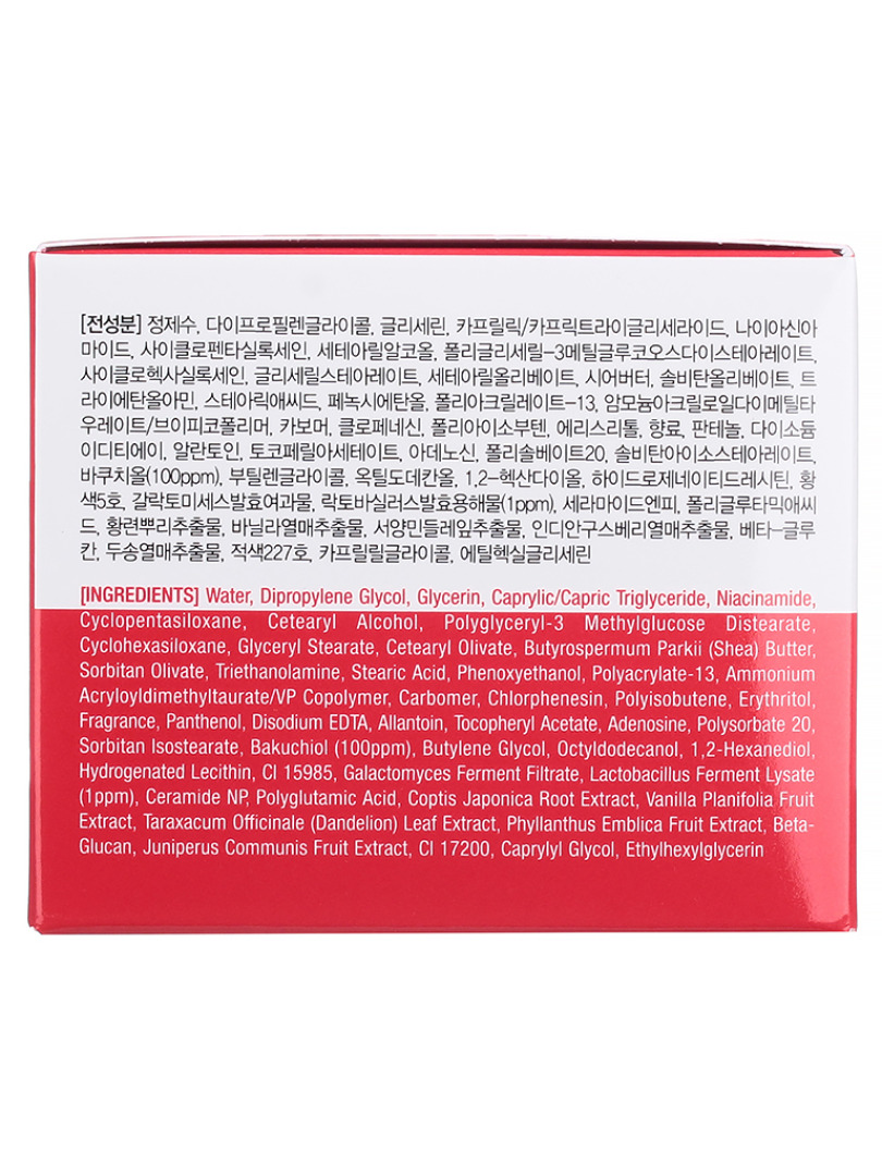 Water, Dipropylene Glycol, Glycerin, Caprylic/Capric Triglyceride, Niacinamide, Cyclopentasiloxane, Cetearyl Alcohol, Polyglyceryl-3 Methylglucose Distearate, Cyclohexasiloxane, Glyceryl Stearate, Cetearyl Olivate, Butyrospermum Parkii (Shea) Butter, Sorbitan Olivate, Triethanolamine, Stearic Acid, Phenoxyethanol, Polyacrylate-13, Ammonium Acryloyldimethyltaurate/VP Copolymer, Carbomer, Chlorphenesin, Polyisobutene, Erythritol, Fragrance, Panthenol, Disodium EDTA, Allantoin, Tocopheryl Acetate, Adenosine, Polysorbate 20, Sorbitan Isostearate, Bakuchiol(100ppm), Butylene Glycol, Octyldodecanol, 1,2-Hexanediol, Hydrogenated Lecithin, CI 15985, Galactomyces Ferment Filtrate, Lactobacillus Ferment Lysate(1ppm), Ceramide NP, Polyglutamic Acid, Coptis Japonica Root Extract, Vanilla Planifolia Fruit Extract, Taraxacum Officinale (Dandelion) Leaf Extract, Phyllanthus Emblica Fruit Extract, Beta-Glucan, Juniperus Communis Fruit Extract, CI 17200, Caprylyl Glycol, Ethylhexylglycerin