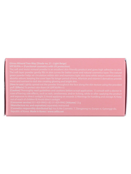Изг-ль: You&Me Cosmetic, Корея, Республика, 7, Dangjeong-ro, Gunpo-si, Gyeonggi-do. Минеральная пудра придает коже естественное свечение, идеально выравнивает тон, снимает раздражение и предотвращает воспалительные процессы, а легкая текстура не забивает поры и позволяет коже дышать. Способ применения: нанесите необходимое количество средства и равномерно растушуйте с помощью спонжа, кисти или подушечек пальцев.