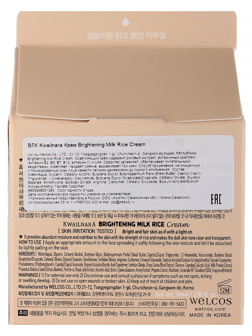 Изг-ль:Welcos Co., LTD., 21-12, Toegyegongdan 1-gil, Chuncheon-si, Gangwon-do, GLN отсутствует, координаты ГЛОНАСС: 37.84811892205644, 127.73585583510236, Корея, Республика. Brightening Milk Rice Cream. Осветляющий крем содержит рисовый экстракт, витаминный комплекс (витамин B2, B3, B7, B12, витамин С) + LHA. Средство увлажняет, обеспечивает питательными веществами, осветляет, придает сияние, выравнивает тон кожи. Способ применения: на очищенную и тонизированную кожу лица нанести легкими движениями до полного впитывания.