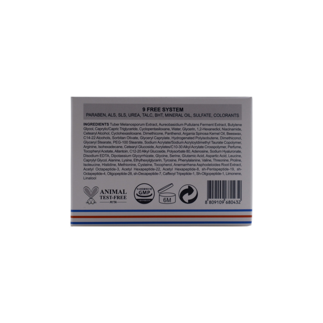 Tuber Melanosporum Extract, Aureobasidium Pullulans Ferment Extract, Butylene Glycol, Caprylic/Capric Triglyceride, Cyclopentasiloxane, Water, Glycerin, 1,2-Hexanediol, Niacinamide, Cetearyl Alcohol, Cyclohexasiloxane, Dimethicone, Panthenol, Argania Spinosa Kernel Oil, Beeswax, C14-22 Alcohols, Sorbitan Olivate, Glyceryl Caprylate, Hydrogenated Polyisobutene, Dimethiconol, Glyceryl Stearate, PEG-100 Stearate, Sodium Acrylate/Sodium Acryloyldimethyl Taurate Copolymer, Arginine, Isohexadecane, Cetearyl Glucoside, Acrylates/C10-30 Alkyl Acrylate Crosspolymer, Perfume, Tocopheryl Acetate, Allantoin, C12-20 Alkyl Glucoside, Polysorbate 80, Adenosine, Sodium Hyaluronate, Disodium EDTA, Dipotassium Glycyrrhizate, Glycine, Serine, Glutamic Acid, Aspartic Acid, Leucine, Caprylyl Glycol, Alanine, Lysine, Ethylhexylglycerin, Tyrosine, Phenylalanine, Valine, Threonine, Proline, Isoleucine, Histidine, Methionine, Cysteine, Tocopherol, Anemarrhena Asphodeloides Root Extract, Acetyl Octapeptide-3, Acetyl Hexapeptide-22, Acetyl Hexapeptide-8, sh-Pentapeptide-19, sh-Octapeptide-4, Oligopeptide-28, sh-Decapeptide-7, Caffeoyl Tripeptide-1, Sh-Oligopeptide-1, Limonene, Linalool
