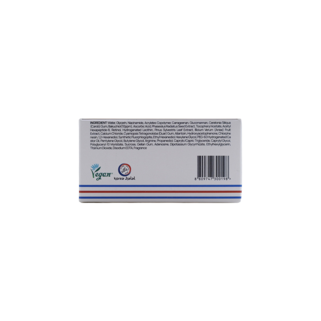 Water, Glycerin , Niacinamide, Acerylates Copolymer, Carrageenan, Glucomannan, Ceratonia SiIiqua (Carob) Gum, BakuchioI, Ascorbic Acid, PhaseoIus Radiatus Seed Extract, Tocopheryl Acetate, Acetyl Hexapeptide-8, Retinol, Hydrogenated Lecithin, Pinus Sylvestris Leaf Extract, Illicium Verum (Anise) Fruit Extract, Calcium Chioride, Cyamopsis Tetragonoloba (Guar) Gum, Allantoin, Hydroxyacetophenone, ChIorphenesin, 1,2-HexanedioI, Synthetic Fluorphlogopite, Ethyl Hexanediol, HexyIene GIycoI, PEG-60 Hydrogenated Castor oiI, Pentylene Glycol, Butylene Glycol, Arginine, Propanediol, Caprylic/Capric Triglyceride, Caprylyl Glycol, Polyglyceryl-10 Myristate, Sucrose, Adenosine, GelIan Gum, Ethylhexylglycerin, Titanium Oioxide, Oipotassium Glycyrrhizate
