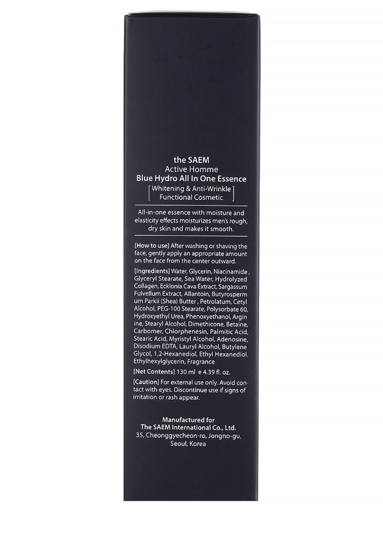 Изг-ль: THE SAEM INTERNATIONAL CO.LTD., КОРЕЯ, РЕСПУБЛИКА, 10F, 35, Cheonggyecheon-ro, Jongno-gu, Seoul. Увлажняющая эссенция «все в одном », обеспечивает легкий комплексный уход: увлажнение, питание, эластичность и гладкую текстуру грубой и сухой мужской кожи. Содержит морские водоросли и морской коллаген, ниацинамид, аденозин и т.д. Способ применения: после очищения или бритья, нанесите необходимое количество и аккуратно распределите по коже.