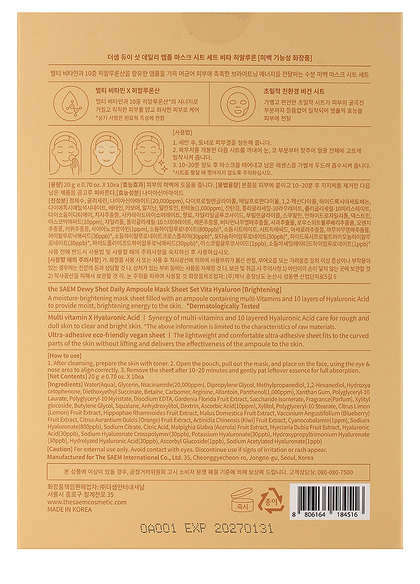 Изг-ль: THE SAEM INTERNATIONAL CO.LTD., КОРЕЯ, РЕСПУБЛИКА, 10F, 35, Cheonggyecheon-ro, Jongno-gu, Seoul. Тканевая маска, пропитана эссенцией, содержащей мультивитамины и 10-кратную гиалуроновую кислоту, синергетические ингредиенты, нанолипосомы сквалана, которые придают жизненную силу, увлажнение грубой и тусклой коже, осветление и сияние. Способ применения: достаньте из упаковки и плотно приложите к очищенному и тонизированному лицу. Подождите 10-20 минут и снимите. Дайте впитаться эссенции, мягкими похлопывающими движениями.