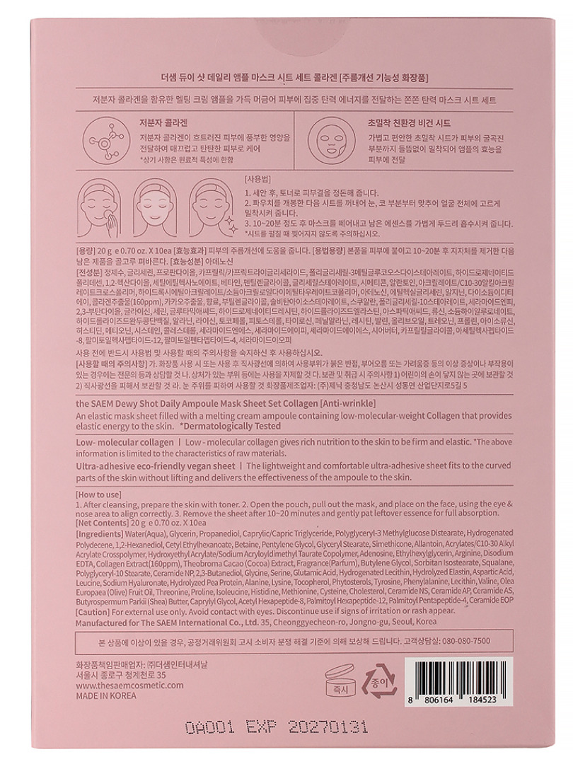 СМ Dewy Shot Набор масок на тканевой основе Dewy Shot Daily Ampoule Mask Sheet Set Collagen 10шт