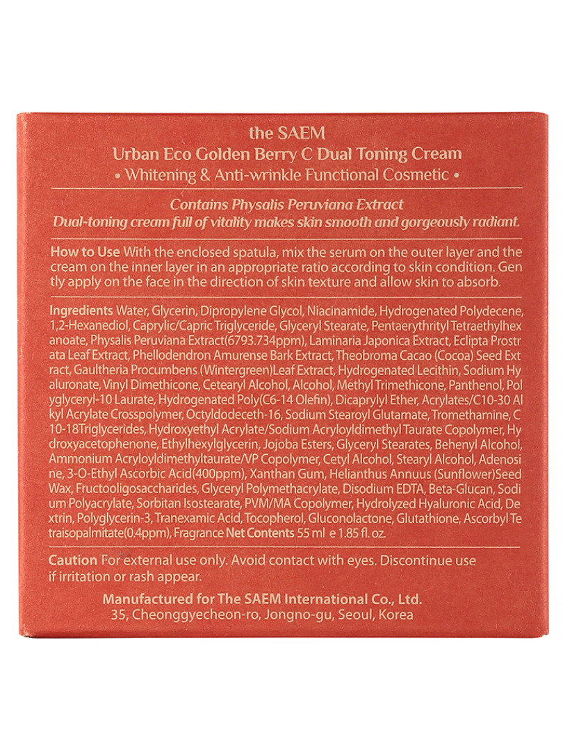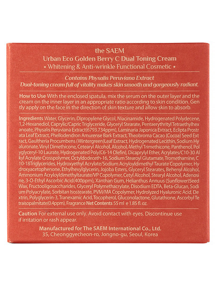 Изг-ль: THE SAEM INTERNATIONAL CO.LTD., КОРЕЯ, РЕСПУБЛИКА, 10F, 35, Cheonggyecheon-ro, Jongno-gu, Seoul. Крем, который делает кожу гладкой, чистой и сияющей. Крем 2 в 1: сыворотка и осветляющий крем. Разглаживающая сыворотка в наружном слое средства, очищает от омертвевших клеток, а интенсивный крем во 2 слое осветляет тусклую кожу. Содержит экстракт физалиса, ниацинамид, 2 типа витамина С. Способ применения: средство можно перемешивать по желанию, в зависимости от состояния вашей кожи. Сыворотка и крем 1 к 1: если необходимо осветлить веснушки/пятна и урегулировать водно-жировой баланс; крем и сыворотка 2 к 1 если: беспокоит тон кожи из-за веснушек и пигментных пятен, кожа очень сухая и тусклая; крем и сыворотка 1 к 2 если: текстура кожи грубая, цвет лица тусклый, обезвоженная кожа и имеет жирный блеск.
