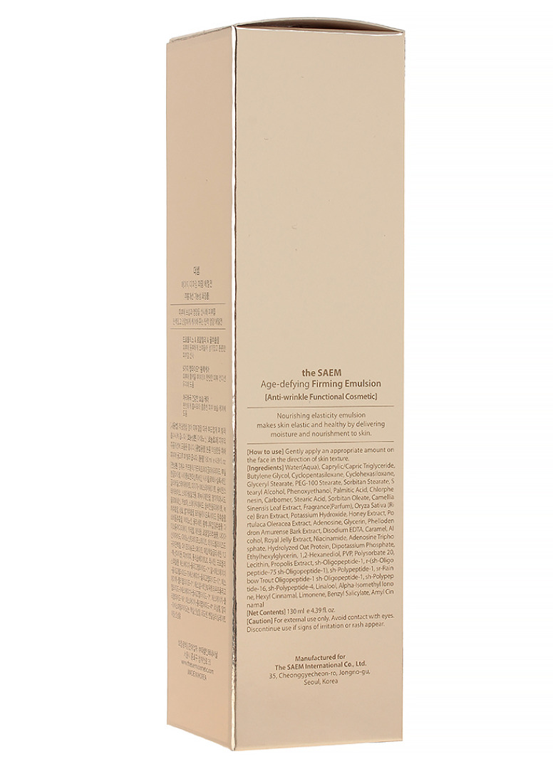 Изг-ль: THE SAEM INTERNATIONAL CO.LTD., КОРЕЯ, РЕСПУБЛИКА, 10F, 35, Cheonggyecheon-ro, Jongno-gu, Seoul. Укрепляющая антивозрастная эмульсия для лица с маточным молочком - питает и улучшает обменные процессы в коже, способствует регенерации клеток поверхностного слоя. Эмульсия улучшает состояние кожи, замедляет процессы старения, способствует разглаживанию мелких морщинок и уменьшению интенсивности глубоких, устраняет дряблость кожи, повышает ее эластичность, препятствует обвисанию, а также повышает сопротивляемость к неблагоприятным условиям окружающей среды. Способ применения: нанести эмульсию на очищенную и тонизированную кожу лица.