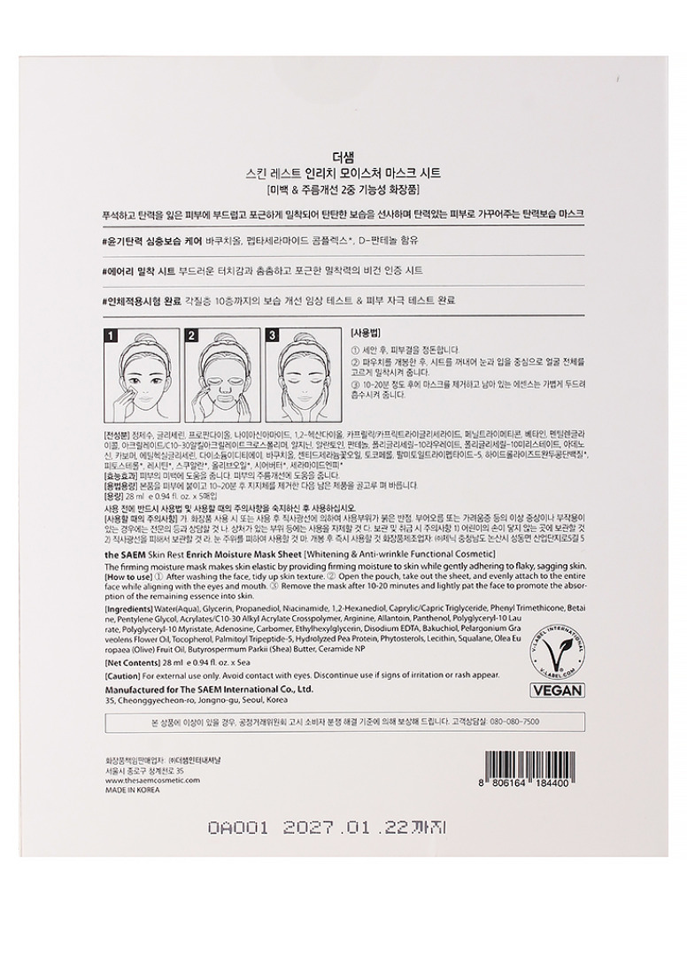 СМ Skin Rest VEGAN Набор масок на тканевой основе Skin Rest Enrich Moisture Mask Sheet (4+1ea)