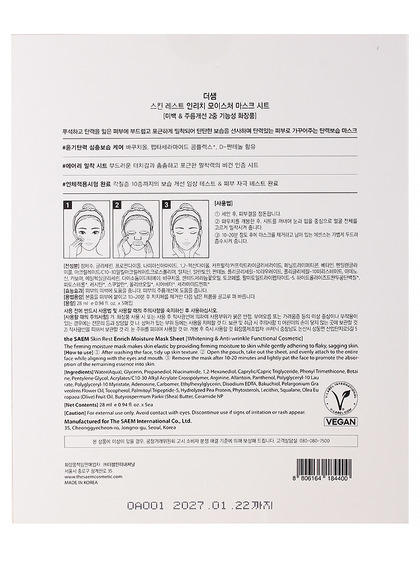 Изг-ль: THE SAEM INTERNATIONAL CO.LTD., КОРЕЯ, РЕСПУБЛИКА, 10F, 35, Cheonggyecheon-ro, Jongno-gu, Seoul. Укрепляющая тканевая маска легко и комфортно прилегает к огрубевшей и потерявшей эластичность коже, обеспечивая обильное увлажнение, а также обеспечивает комфортный уход. Содержит ингредиенты (бакучиол, д-пантетонл, аденозин и т.д.), которые повышают эластичность и глубоко увлажняют. Маска пропитана увлажняющей кремовой эссенцией. Содержит 5 листов. Способ применения: достаньте из упаковки и плотно приложите к очищенному и тонизированному лицу. Подождите 10-20 минут и снимите. Дайте впитаться эссенции, мягкими похлопывающими движениями.