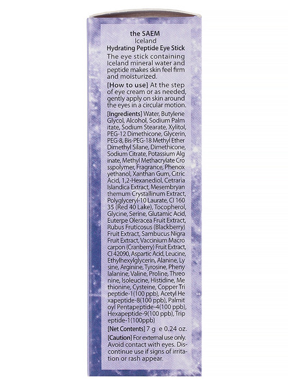 Изг-ль: THE SAEM INTERNATIONAL CO.LTD., КОРЕЯ, РЕСПУБЛИКА, 10F, 35, Cheonggyecheon-ro, Jongno-gu, Seoul. Стик для кожи вокруг для глаз содержит исландскую минеральную воду и пептидный комплекс, которые сохраняют кожу упругой и увлажненной. Средство обеспечивает сухую кожу лица питательными веществами, оказывает освежающее увлажнение, создает охлаждающий эффект. Способ применения: Нанесите средство круговыми движениями, начиная от внутреннего уголка глаз по верхнему веку, а затем от внешнего к внутреннему – по нижнему веку.