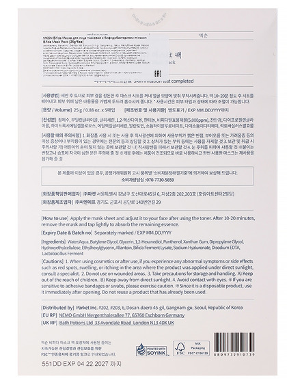 Изготовитель: Parket Inc., 3rd floor, 65, Eonju-ro 211-gil, Gangnam-gu, Seoul, Республика Корея. Маска с лизатом бифидобактерий интенсивно увлажняет кожу лица и улучшает состояние уставшей, сухой и ослабленной кожи. Средство, созданное на основе натуральных ингредиентов, укрепляет естественный защитный барьер кожи, предотвращая появление сухости, и повышает эластичность. Маска дарит коже защиту и улучшает её тон, восстанавливая сияние.Способ применения: на очищенную и тонизированную кожу лица нанесите маску на 10-20 мин., остатки эссенции распределите по коже.