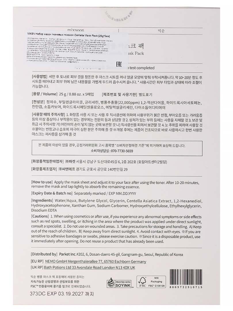MXSN Маска тканевая mixsoon Centella Mask Pack 25g