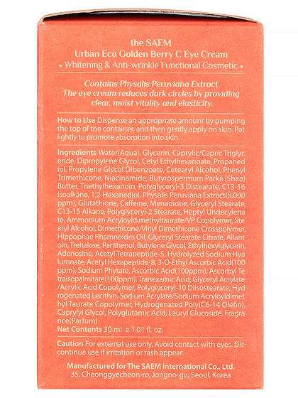 Изг-ль: THE SAEM INTERNATIONAL CO.LTD., КОРЕЯ, РЕСПУБЛИКА, 10F, 35, Cheonggyecheon-ro, Jongno-gu, Seoul. Крем для кожи вокруг глаз с экстрактом физалиса и витамином С уменьшает темные круги, тусклый цвет кожи под глазами, восстанавливает жизненную силу и эластичность кожи. Крем содержит эссенцию, который устраняет тусклость вокруг глаз, (вызванную УФ-лучами), старение и усталость кожи, делая кожу сияющей и здоровой. Содержит экстракт физалиса (перуанской золотой ягоды), 2 вида витамина С, витамин К, гиалуроновую кислоту и т.д. Способ применения: нажмите на помпу, чтобы выдавить необходимое количество крема, нанесите на кожу. Средство можно наносить на носогубную область, в области рта, шеи.
