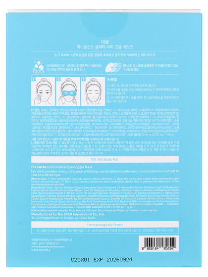 Изг-ль: THE SAEM INTERNATIONAL CO.LTD., КОРЕЯ, РЕСПУБЛИКА, 10F, 35, Cheonggyecheon-ro, Jongno-gu, Seoul. Маска тканевая с глиттером для кожи вокруг глаз обеспечивает концентрированное увлажнение и питание кожи, сохраняя ее влагу и сияние. Лист маски изготовлен из трехслойной структуры: тенсел 100% + гидрогель+тенсел 100%. Обеспечивает хорошую адгезию и ощущение увлажненности в течение длительного времени. Содержит экстракт исландского мха, витаминный комплекс и гиалуроновую кислоту. Способ применения: после тонизирования, наложить маску вокруг глаз на 10-15 минут.