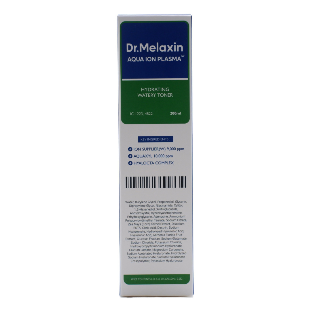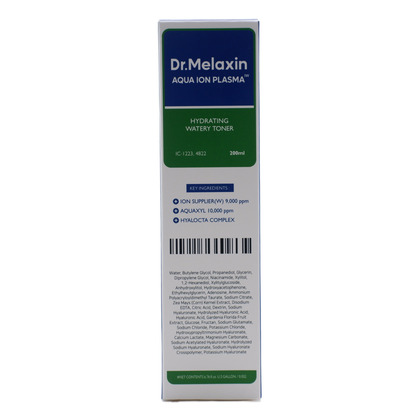 Изг-ль: BRAND 501 Co., Ltd., Корея, Республика, 20, Achasan-ro 9-gil, Seongdong-gu, Seoul. Dr.Melaxin Aqua Ion Plasma Hydrating Watery Toner — легкий увлажняющий тонер первого шага ухода, содержащий запатентованный ингредиент Aquaxyl для предотвращения потери влаги и укрепления кожного барьера. Формула с восемью слоями гиалуроновой кислоты различных молекулярных размеров обеспечивает многоуровневое увлажнение от поверхности до глубоких слоев эпидермиса. Тонер содержит специальные ионы, регулирующие баланс влаги в коже, ниацинамид, аденозин, экстракт кукурузы, экстракт гардении и калий. Легкая водянистая текстура быстро впитывается, не оставляя липких ощущений, подходит для всех типов кожи. Прошел тесты на низкий уровень раздражения.