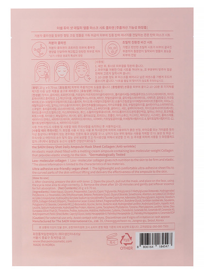 Изг-ль: THE SAEM INTERNATIONAL CO.LTD., КОРЕЯ, РЕСПУБЛИКА, 10F, 35, Cheonggyecheon-ro, Jongno-gu, Seoul. Тканевая маска, пропитана кремовой сывороткой, содержащей низкомолекулярный коллаген, гиалуроновую кислоту 3 вида пептид, 5 видов церамидов, сквалан и т.д., маска насыщает кожу питательными веществами, придает эластичность и жизненную силу. Способ применения: достаньте из упаковки и плотно приложите к очищенному и тонизированному лицу. Подождите 10-20 минут и снимите. Дайте впитаться эссенции, мягкими похлопывающими движениями.