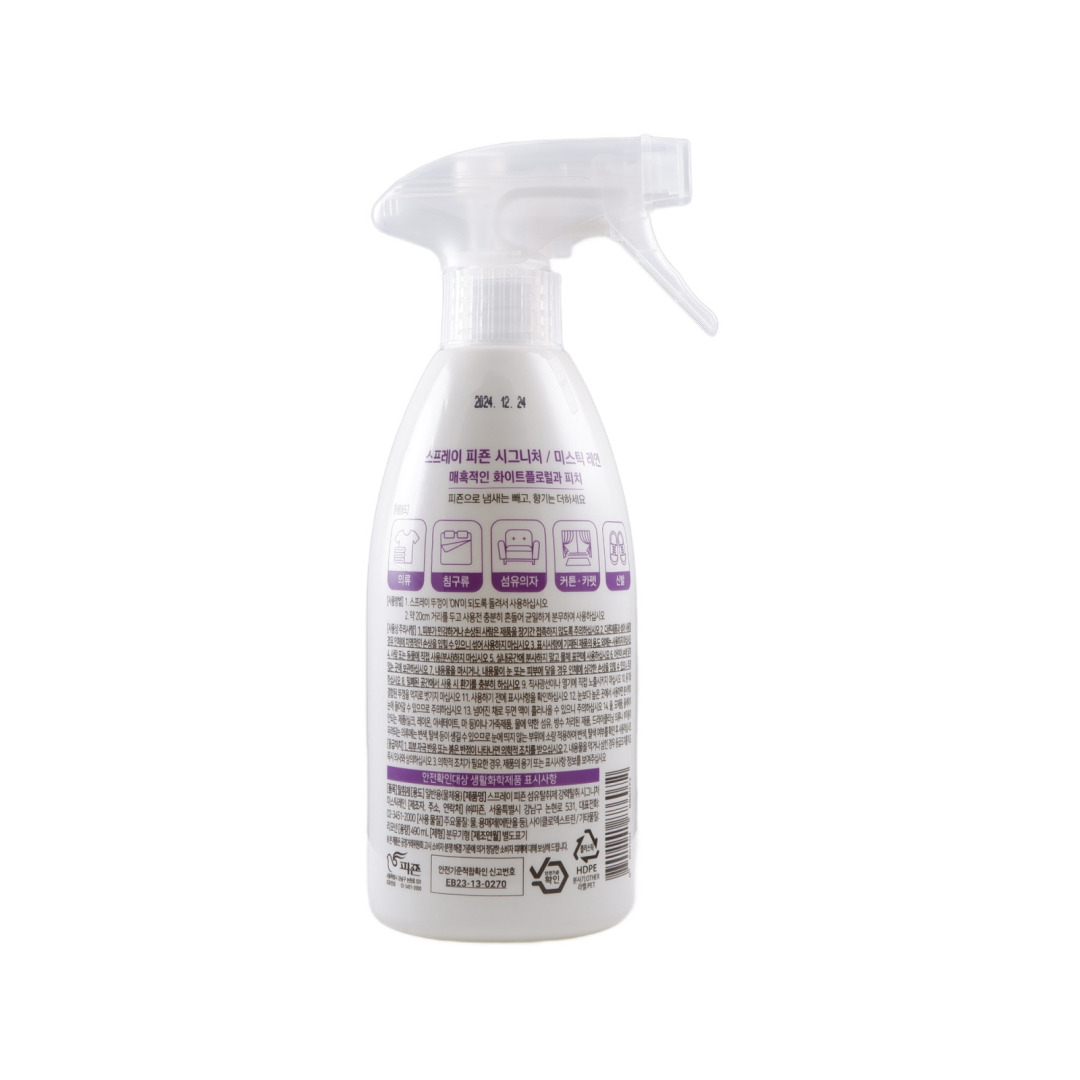 Изг-ль: PIGEON CORPORATION, КОРЕЯ, РЕСПУБЛИКА, 628-13, Yoksam-dong, Kangnam-ku, Seul, 135-080. Спрей-кондиционер с богатым и стойким ароматом манящих белых цветов и персика. В 3 раза более концентрированный по сравнению с обычным кондиционером. Спрей дезодорирует и удаляет посторонние запахи с тканей, придаёт изысканный аромат, убирает статическое электричество, обладает антибактериальным эффектом. Способ применения: встряхнуть, перевести спрей в положение «On ». Распылить на вещи с расстояния 20-30 см, просушить.