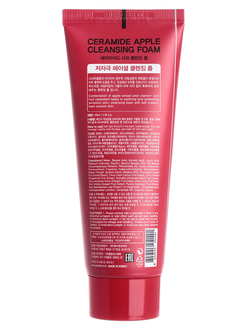 Изг-ль: Beautynetkorea Co. Ltd., КОРЕЯ, РЕСПУБЛИКА, 20, Baekbeom-ro 577beon-gil, Bupyeong-gu, Incheon. Пенка для умывания с экстрактом яблока. Кислоты и витамины из яблок удаляют омертвевшие клетки на поверхности кожи и открывают поры для эффективного глубокого очищения. Ключевой компонент средств – керамиды, которые восстанавливают липидный барьер верхнего слоя эпидермиса сухой кожи, предупреждают обезвоживание и обеспечивают интенсивное увлажнение. Имеет кислотно-щелочной баланс 7.56. Способ применения: выдавите нужное количество средства на ладони, вспеньте, аккуратно нанесите на лицо и помассируйте, затем смойте теплой водой.