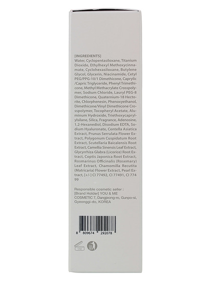 Water, Cyclopentasiloxane, Titanium Dioxide, Ethylhexyl Methoxycinnamate, Cyclohexasiloxane, Butylene Glycol, Glycerin, Niacinamide, Cetyl PEG/PPG-10/1 Dimethicone, Caprylic/Capric Triglyceride, Phenyl Trimethicone, Methyl Methacrylate Crosspolymer, Sodium Chloride, Lauryl PEG-8 Dimethicone, Quaternium-18 Hectorite, Chlorphenesin, Phenoxyethanol, Dimethicone/Vinyl Dimethicone Crosspolymer, Tocopheryl Acetate, Aluminum Hydroxide, Triethoxycaprylylsilane, Silica, Fragrance, Adenosine, 1,2-Hexanediol, Disodium EDTA, Sodium Hyaluronate, Centella Asiatica Extract, Prunus Serrulata Flower Extract, Polygonum Cuspidatum Root Extract, Scutellaria Baicalensis Root Extract, Camellia Sinensis Leaf Extract, Glycyrrhiza Glabra (Licorice) Root Extract, Coptis Japonica Root Extract, Rosmarinus Officinalis (Rosemary) Leaf Extract, Chamomilla Recutita (Matricaria) Flower Extract, Pearl Extract, CI 77492, CI 77491, CI 77499