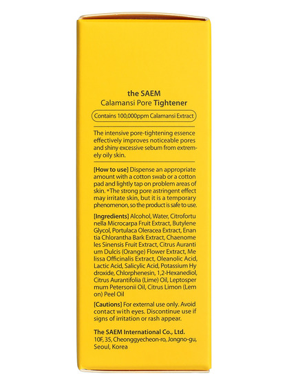 Изг-ль: THE SAEM INTERNATIONAL CO.LTD., КОРЕЯ, РЕСПУБЛИКА, 10F, 35, Cheonggyecheon-ro, Jongno-gu, Seoul. Средство насыщенно витамином С и синефурином, содержащимся в экстракте каламанси. Линия для эффективного ухода за жирной кожей, контролирует работу сальных желез, восстанавливает гладкость эпидермиса, способствует сохранению свежести и яркости тона. Интенсивная терапия для кожи, склонной к появлению расширенных пор и угрей, восстановление свежести и мягкости кожи. Способ применения: нанесите небольшое количество эссенции на ватный диск или палочку мягко похлопывающими движениями нанесите на кожу лица.