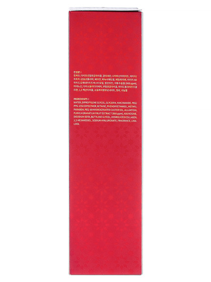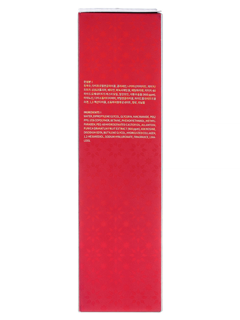 Water, Dipropylene glycol, Glycerin, Peg/ppg-17/6 copolymer, Niacinamide, Betaine, Phenoxyethanol, Methylparaben, Peg-60 hydrogenated castor oil, Allantoin, Punica granatum fruit extract, Adenosine, Disodium edta, Fragrance, Butylene glycol, Hydrolyzed collagen, 1,2-hexanediol, Sodium hyaluronate