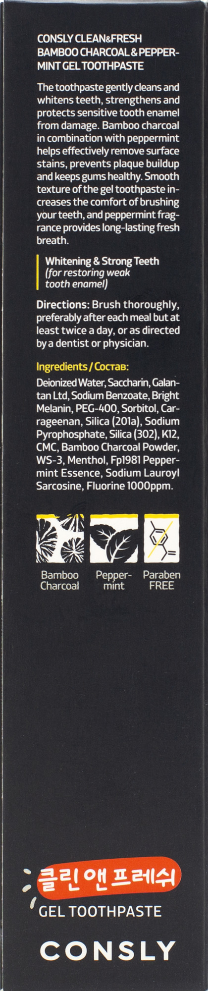 Deionized Water, Saccharin, Galantan Ltd, Sodium Benzoate, Bright Melanin, PEG-400, Sorbitol, Carrageenan, Silica (201a), Sodium Pyrophosphate, Silica (302), K12, CMC, Bamboo Charcoal Powder, WS-3, Menthol, Fp1981 Peppermint Essence, Sodium Lauroyl Sarcosine, Fluorine 1000ppm.