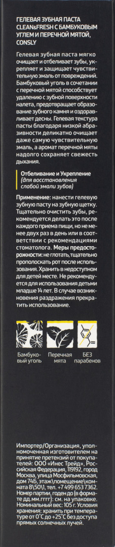 Гелевая зубная паста мягко очищает и отбеливает зубы, укрепляет и защищает чувствительную эмаль от повреждений. Бамбуковый уголь в сочетании с перечной мятой способствует удалению с зубной поверхности налета, предотвращает образование зубного камня и оздоравливает десны. Гелевая текстура пасты благодаря низкой абразивности деликатно очищает даже самую чувствительную эмаль, а аромат перечной мяты надолго сохраняет свежесть дыхания. Способ применения: нанести гелевую зубную пасту на зубную щетку. Тщательно очистить зубы, рекомендуется делать это после каждого приема пищи, но не менее двух раз в день или в соответствии с рекомендациями стоматолога.