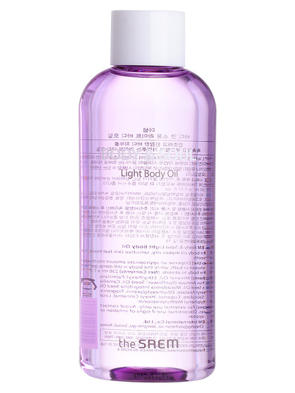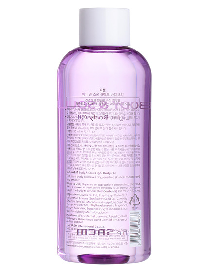 Изг-ль: THE SAEM INTERNATIONAL CO.LTD., КОРЕЯ, РЕСПУБЛИКА, 10F, 35, Cheonggyecheon-ro, Jongno-gu, Seoul. Масло для тела Body & Soul Light Body Oil. Легкая текстура и высокое содержание натуральных компонентов делают масло для кожи тела идеальным для борьбы с первыми признаками старения кожи. В составе средства 100% натуральные масла, которые не содержат консерванты, отдушки и прочие синтетические компоненты. Масло подсолнечника, семян камелии, макадамии, витамин E питают и смягчают кожу, устраняют шелушения, способствуют разглаживанию рельефа. Насыщенная питательными веществами кожа становится гладкой, мягкой, бархатистой. Способ применения: нанести на чистую сухую кожу тела массажными движениями.