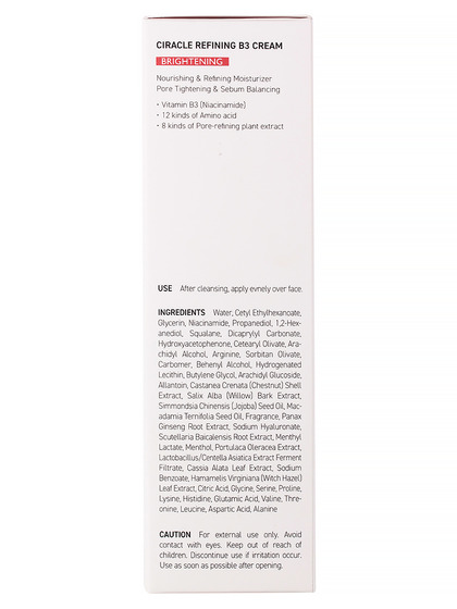 Изг-ль: COTDE Co.Ltd., КОРЕЯ, РЕСПУБЛИКА, 19-3, Ugakgol-gil, Jangsan-ri, Dongnam-gu, Cheonan-si, Chungcheongnam-do. Крем для лица Ciracle Refining B3 Cream Brightening с витамином В3, который поможет уменьшить появление увеличенных пор, неровный тон кожи, морщины и сухость кожи. Витамин В3 отличается мощным осветляющим эффектом, выравнивает тон кожи и оказывает успокаивающее действие. В составе крема 9 видов растительных экстрактов и 10 видов аминокислот, что делает кожу здоровой и свежей. Способ применения: нанесите достаточное количество средства на предварительно очищенную и тонизированную кожу.
