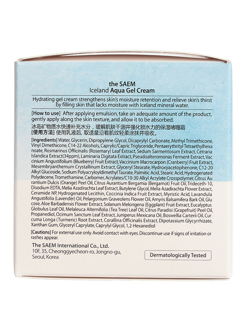 Изг-ль: «THE SAEM INTERNATIONAL CO.LTD. », КОРЕЯ, РЕСПУБЛИКА, 10F, 35, Cheonggyecheon-ro, Jongno-gu, Seoul. Крем-гель для лица с исландской минеральной водой для борьбы с обезвоживанием и повышения способности кожи удерживать влагу. С экстрактами исландского мха, водорослями и морскими активными ингредиентами которые укрепляют кожный барьер и удерживают влагу. Идеальное насыщение влагой кожи любого типа. Кожа увлажнена, как на поверхности, так и изнутри в течение всего дня. Способ применения: нанести крем-гель на очищенную кожу лица легкими массирующими движениями.