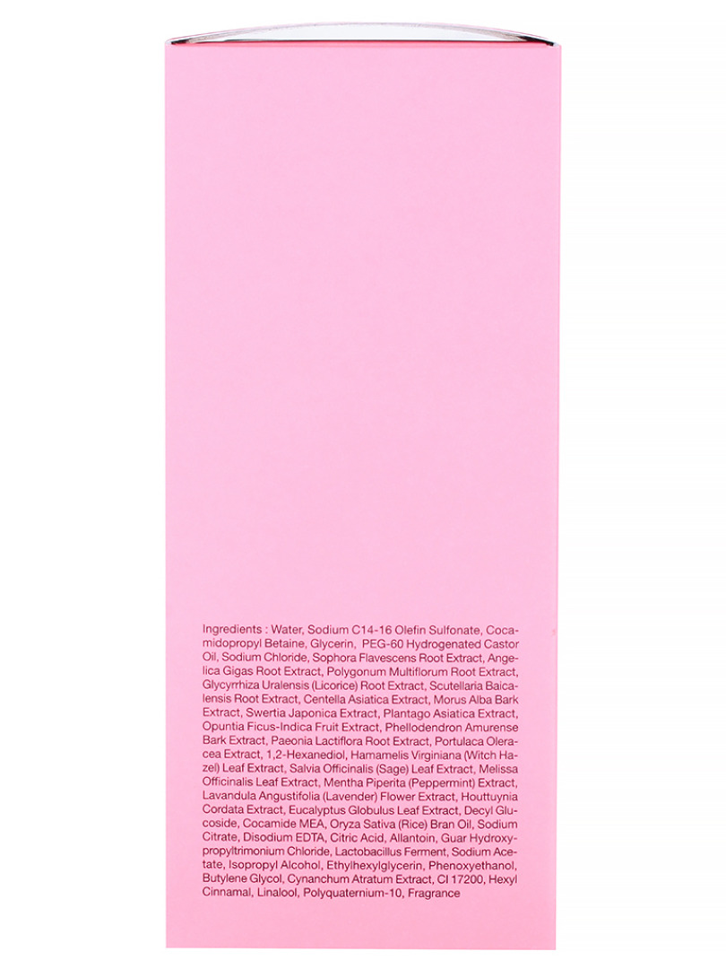 Water, Sodium C14-16 Olefin Sulfonate, Cocamidopropyl Betaine, Sodium Chloride, Glycerin, PEG-60 Hydrogenated Castor Oil, Sophora Flavescens Root Extract, Angelica Gigas Root Extract, Polygonum Multiflorum Root Extract, Houttuynia Cordata Extract, "Glycyrrhiza Uralensis (Licorice) Root, Extract", Scutellaria Baicalensis Root Extract, Centella Asiatica Extract, Morus Alba Bark Extract, Swertia Japonica Extract, Plantago Asiatica Extract, Opuntia Ficus-Indica Fruit Extract, Phellodendron Amurense Bark Extract, Paeonia Lactiflora Root Extract, Portulaca Oleracea Extract, 1,2-Hexanediol, Fragrance (Hexyl Cinnamal, Linalool), Polyquaternium-10, Sodium Acetate, Isopropyl Alcohol, "Hamamelis Virginiana (Witch Hazel), Leaf Extract", Salvia Officinalis (Sage) Leaf Extract, Melissa Officinalis Leaf Extract, Mentha Piperita (Peppermint) Extract, "Lavandula Angustifolia (Lavender), Flower Extract", Eucalyptus Globulus Leaf Extract, Decyl Glucoside, Cocamide MEA, Oryza Sativa (Rice) Bran Oil, Sodium Citrate, Disodium EDTA, Citric Acid, Allantoin, "Guar Hydroxypropyltrimonium, Chloride", Lactobacillus Ferment, Ethylhexylglycerin, Phenoxyethanol, Butylene Glycol, Cynanchum Atratum Extract, CI 17200