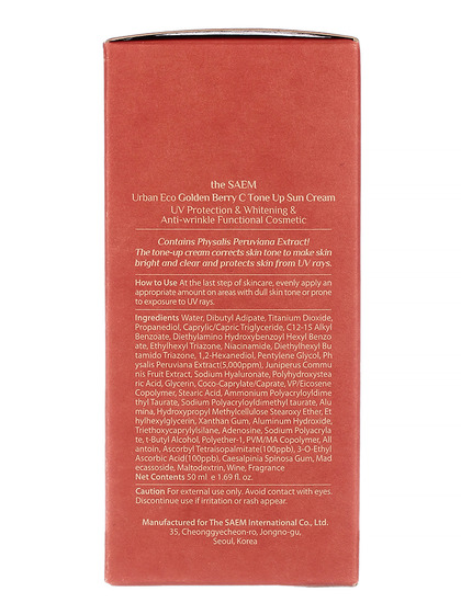 Изг-ль: THE SAEM INTERNATIONAL CO.LTD., КОРЕЯ, РЕСПУБЛИКА, 10F, 35, Cheonggyecheon-ro, Jongno-gu, Seoul. Легкий солнцезащитный крем из осветляющей серии против морщин и пигментации, содержит 80% экстракта золотой перуанской ягоды (физалиса). Используется уникальная формула микропузырьков с витаминами, которые «растворяют » пигментные пятна и несовершенства. Vegan. Способ применения: На завершающем этапе ухода за кожей нанести достаточное количество средства. Уменьшение количества крема или неравномерное распределение значительно снизит уровень защиты. Не рекомендуется долгое нахождение на солнце, даже при использовании солнцезащитного крема.