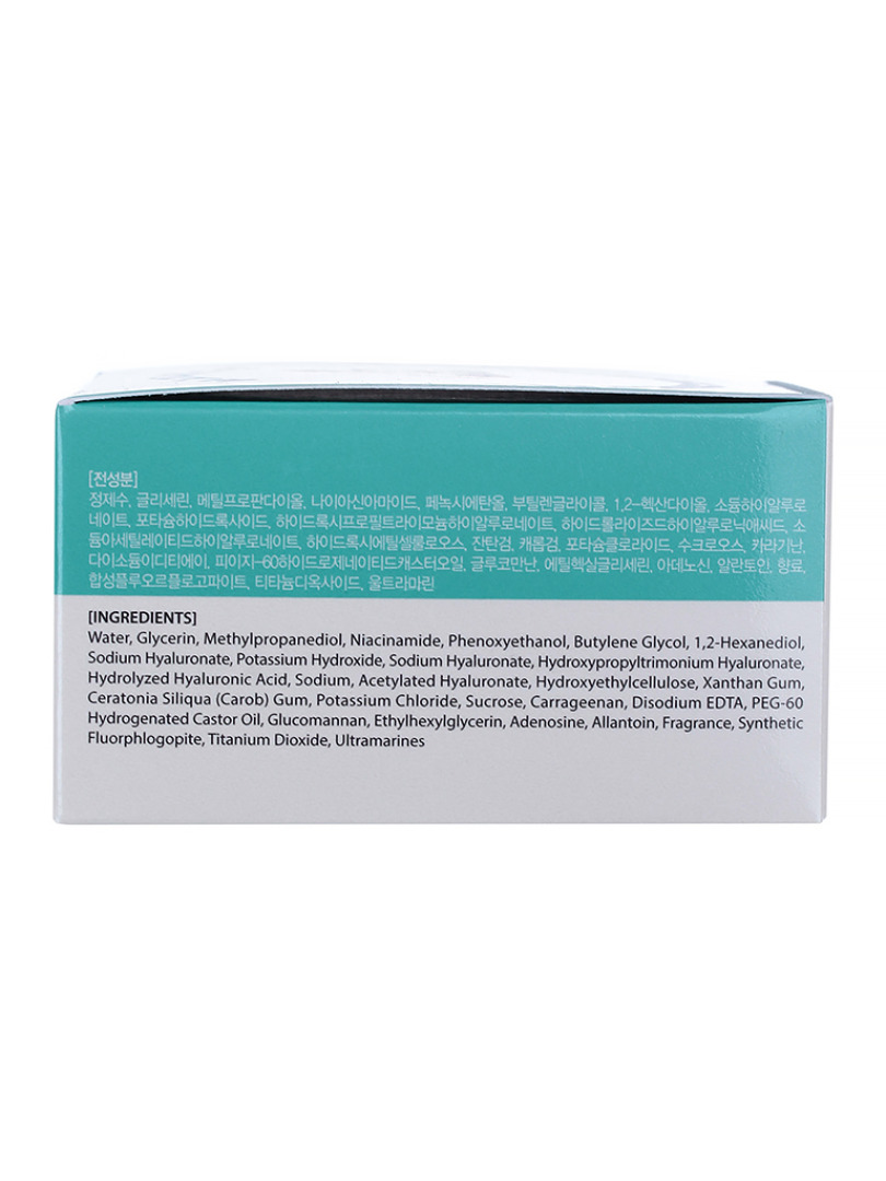 Water, Glycerin, Methylpropanediol, Niacinamide, Phenoxyethanol, Butylene Glycol, 1,2-Hexanediol, Sodium Hyaluronate, Potassium Hydroxide, Hydroxypropyltrimonium Hyaluronate, Hydrolyzed Hyaluronic Acid, Sodium Acetylated Hyaluronate, Hydroxyethylcellulose, Xanthan Gum, Ceratonia Siliqua (Carob) Gum, Potassium Chloride, Sucrose, Carrageenan, Disodium EDTA, PEG-60 Hydrogenated Castor Oil, Glucomannan, Ethylhexylglycerin, Adenosine, Allantoin, Synthetic Fluorphlogopite, Titanium Dioxide, Ultramarines, Fragrance