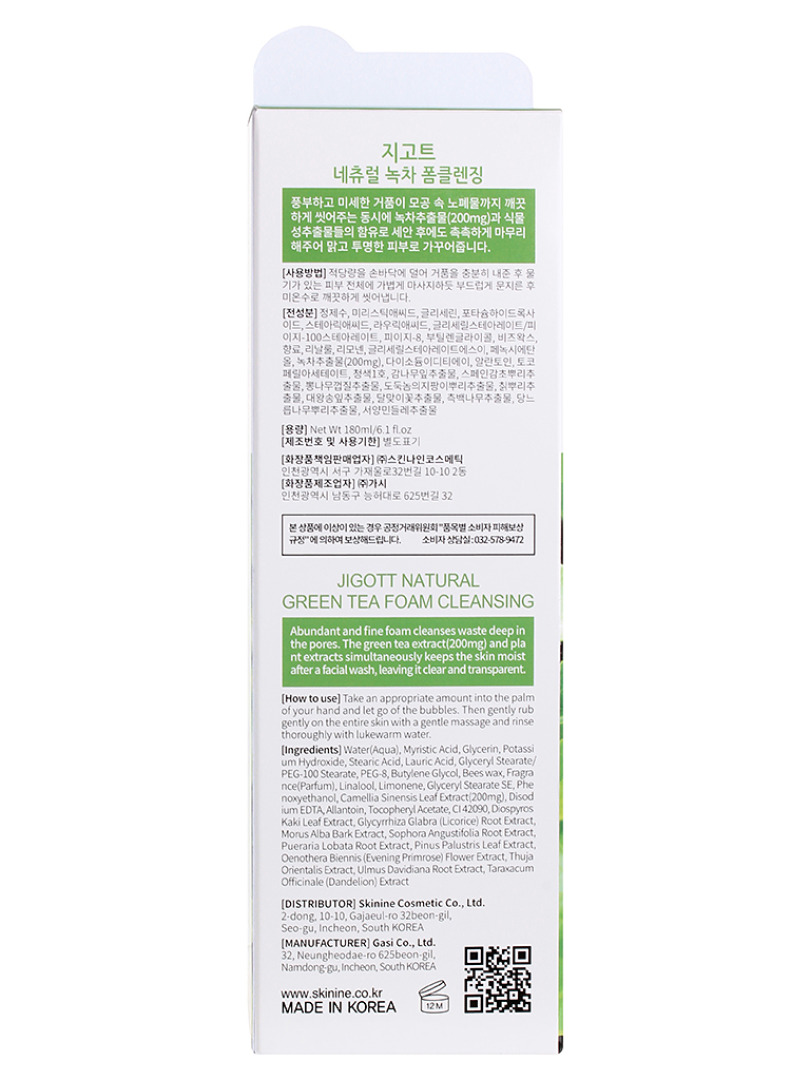 Изготовитель: Gasi Cosmetic Co.,Ltd., Республика Корея, 32, Neungheodae-ro, 625 beon-gil, Namdong-gu, Incheon. Пенка содержит экстракт зеленого чая, обладающий высоким антиоксидантным эффектом. Нежная обильная пенка великолепно удаляет загрязнения, излишки кожного сала и ороговевшие клетки, очищает поры. Экстракт зеленого чая и комплекс растительных экстрактов интенсивно увлажняет, очищает кожу, возвращает ей здоровый вид и придает сияние. Способ применения: выдавить небольшое количество средства на руки, вспенить с водой и массажными движениями нанести на лицо. Тщательно смыть.
