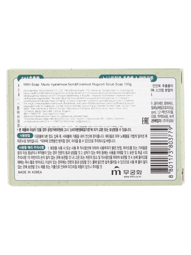 Изготовитель: MUKUNGHWA CO. LTD., Республика Корея, 173, Galmaji-gil, Dongducheon-si, Gyeonggi-do. Мыло-скраб Noni&Foremost Mugwort Scrub Soap является источником различных витаминов, минералов и ненасыщенных жирных кислот, которые эффективны в борьбе с первыми признаками старения кожи и свободными радикалами. Экстракт фруктов Нони является мощным антиокисдантом со сложным и уникальным антивозрастным составом, который позволяет сохранить здоровье вашей кожи и освежить тон лица, стимулировать клеточное обновление, а его анти-бактериальные и анти-грибковые функции защищают кожу от инфекций.