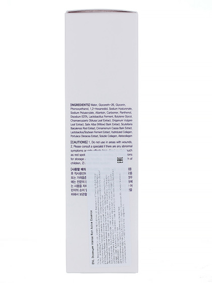 Water, Glycereth-26, Glycerin, Water, Phenoxyethanol, 1,2-Hexanediol, Sodium Hyaluronate, Sodium Polyacrylate, Water, Allantoin, Panthenol, Carbomer, Disodium EDTA, Lactobacillus Ferment, Butylene Glycol, 1,2 Hexanediol, Atelocollagen, Hydrolyzed Collagen, Soluble Collagen, Water, Butylene Glycol, 1,2-Hexanediol, Water, Butylene Glycol, Salix Alba (Willow) Bark Extract, Origanum Vulgare Leaf Extract, Chamaecyparis Obtusa Leaf Extract, Lactobacillus/Soybean Ferment Extract, Cinnamomum Cassia Bark Extract, Scutellaria Baicalensis Root Extract, Portulaca Oleracea Extract