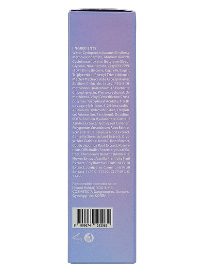 Water, Cyclopentasiloxane, Ethylhexyl Methoxycinnamate, Titanium Dioxide, Cyclohexasiloxane, Butylene Glycol, Glycerin, Niacinamide, Cetyl PEG/PPG-10/1 Dimethicone, Caprylic/Capric Triglyceride, Phenyl Trimethicone, Methyl Methacrylate Crosspolymer, Sodium Chloride, Lauryl PEG-8 Dimethicone, Quaternium-18 Hectorite, Chlorphenesin, Phenoxyethanol, Dimethicone/Vinyl Dimethicone Crosspolymer, Tocopheryl Acetate, Triethoxycaprylylsilane, 1,2-Hexanediol, Aluminum Hydroxide, Silica, Fragrance, Adenosine, Panthenol, Disodium EDTA, Sodium Hyaluronate, Centella Asiatica Extract, Hydrolyzed Collagen, Polygonum Cuspidatum Root Extract, Scutellaria Baicalensis Root Extract, Camellia Sinensis Leaf Extract, Glycyrrhiza Glabra (Licorice) Root Extract, Coptis Japonica Root Extract, Rosmarinus Officinalis (Rosemary) Leaf Extract, Chamomilla Recutita (Matricaria) Flower Extract, Vanilla Planifolia Fruit Extract, Phyllanthus Emblica Fruit Extract, Juniperus Communis Fruit Extract, CI 77492, CI 77491, CI 77499