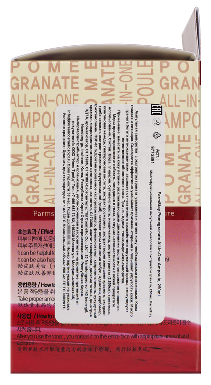 Изготовитель: MYUNGIN COSMETICS CO. LTD., 441-4, Gongneungcheon-ro, Ilsandong-gu, Goyang-si, Gyeonggi-do, РЕСП. КОРЕЯ. Ампульная сыворотка с экстрактом граната увлажняет и питает кожу необходимыми витаминами. Кожа гладкая и сияющая. Гранат богат антиоксидантами, защищает от негативного воздействия окружающей среды, стимулирует естественное обновление кожи.