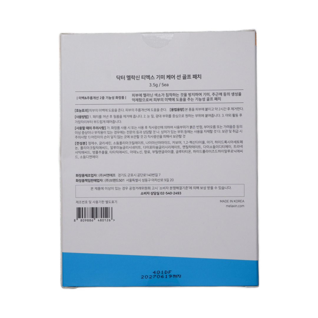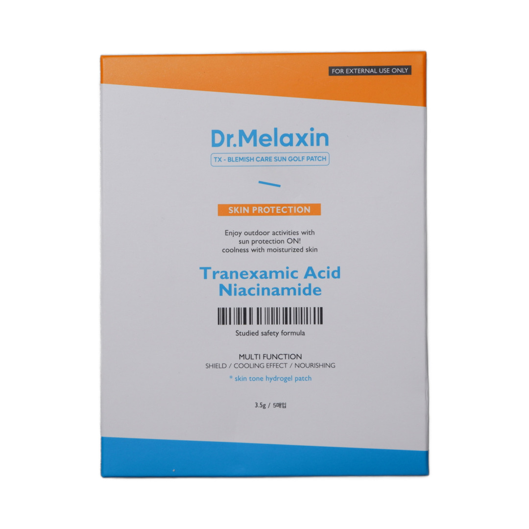 Изг-ль: BRAND 501 Co., Ltd., Корея, Республика, 20, Achasan-ro 9-gil, Seongdong-gu, Seoul. Dr.MELAXIN TX-BLEMISH CARE SUN GOLF PATCH — солнцезащитные гидрогелевые патчи с веганской формулой и защитой от УФ-излучения до 98,9%. Формула содержит PDRN, который стимулирует регенерацию клеток, укрепляет кожный барьер, повышает упругость и способствует восстановлению после воздействия солнца.