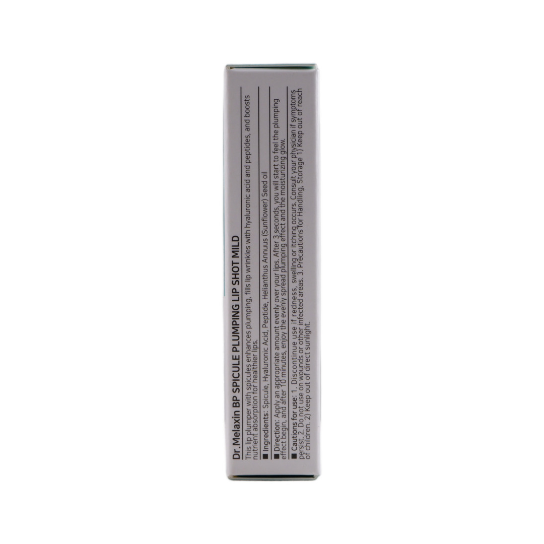 Изготовитель: BRAND 501 Co., Ltd., Республика Корея. Dr.Melaxin BP Spicule Plumping Lip Shot Mild — деликатная формула плампера для чувствительных губ с нежным объёмом и стеклянным блеском. Микрочастицы био-спикул мягко стимулируют кожу губ, усиливая микроциркуляцию, а гиалуроновая кислота и глицерин обеспечивают глубокое увлажнение и разглаживание. В составе масло подсолнечника и ши для питания и эластичности, аденозин и пептид Palmitoyl Hexapeptide-12 для улучшения гладкости и упругости. Охлаждающий ментиллактат и мягкий ваниллиловый эфир придают комфортное тепло-холодное ощущение и естественный розовый оттенок. Невесомая нелипкая текстура создаёт водяной глянец, подходит для соло-нанесения и поверх помады. Прошёл тест на низкий уровень раздражения.